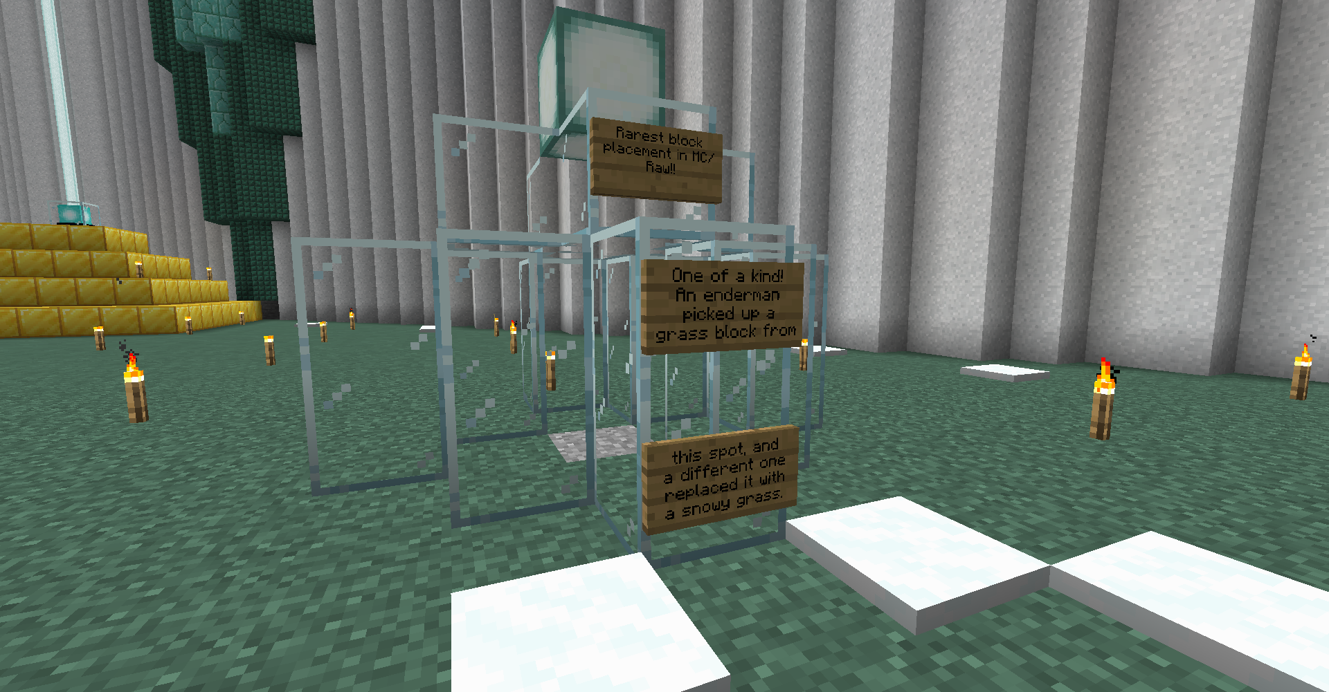 A grass block taken by an enderman and replaced with a snowy one by a different enderman.